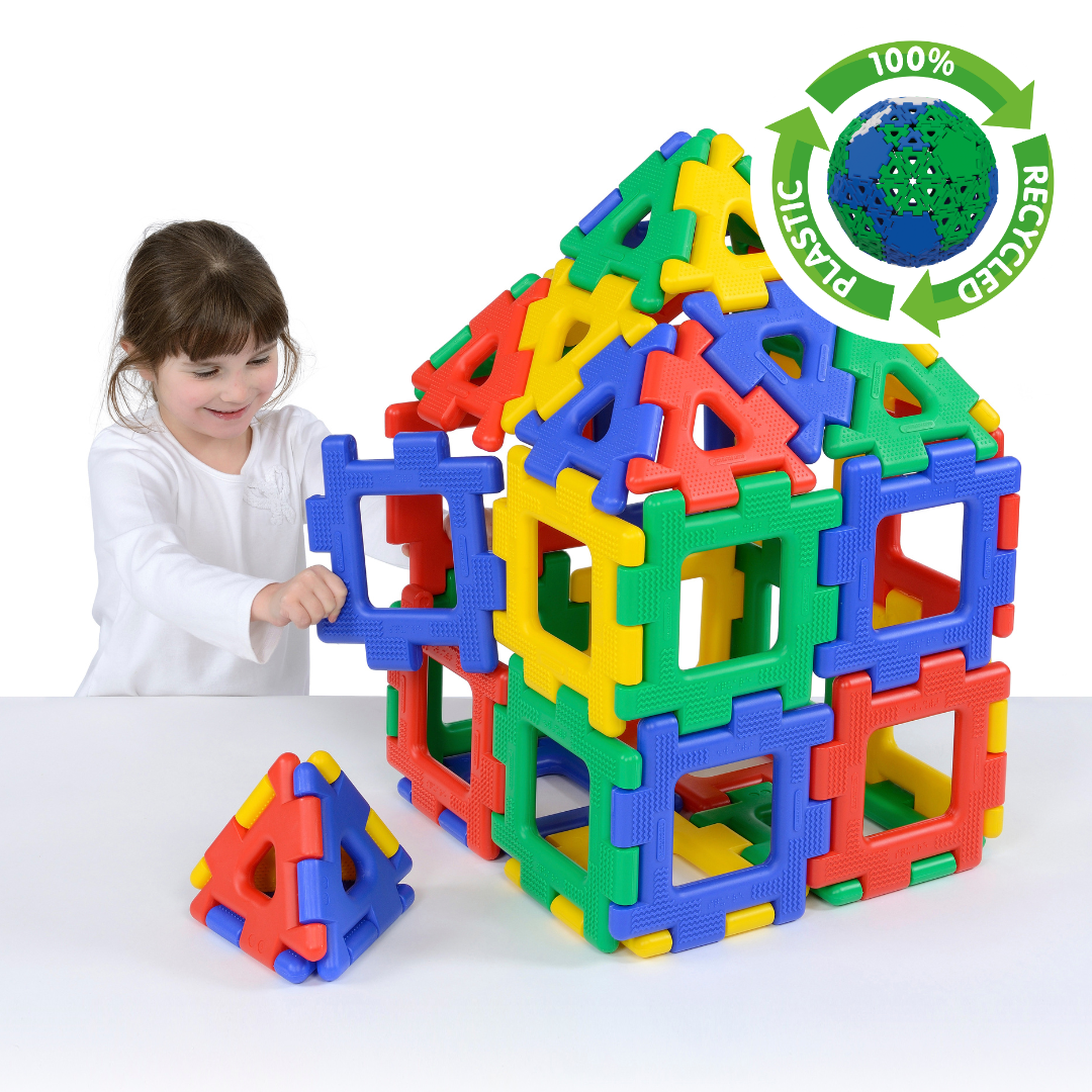This starter set contains the two fundamental shapes of all construction products: squares and triangles. They are therefore a perfect and inspiring introduction to all areas of construction. All the pieces are made from 100% recycled plastic. The chunky pieces mean that it is great for little hands.