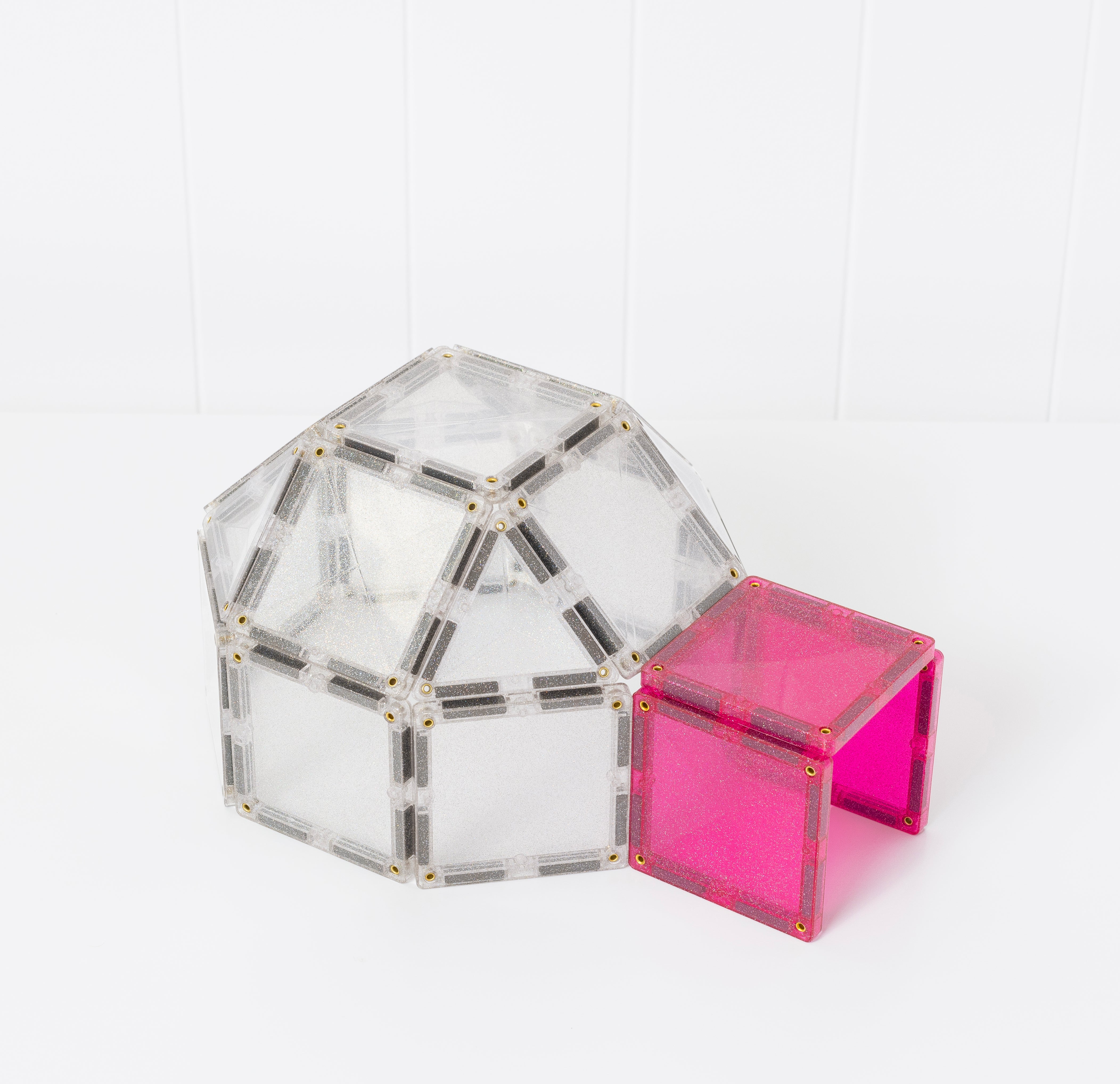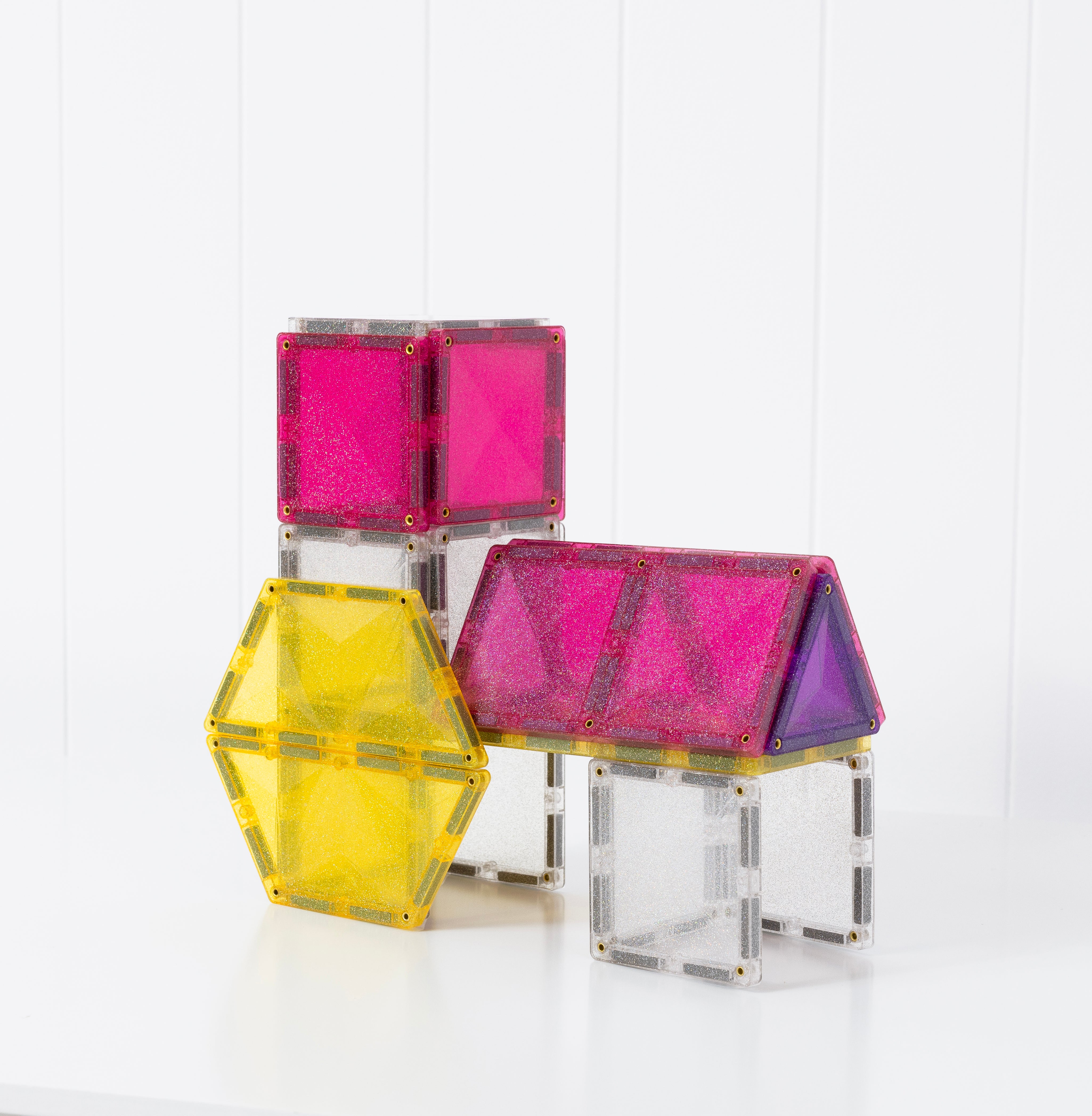 Designed for the unicorn lovers, fantasy dreamers and creative explorers, this pack is filled with delightful play possibilities. Featuring a stunning combination of glitter magnetic tiles in dazzling clear and vibrant bright colours of pink, yellow, teal and purple, plus a thoughtful selection of shapes in squares, hexagons, rectangles, triangles and trapezoids to bring your sparkly unicorn creation to life! Experience the Magic of Open-ended Play? Each tile is bursting with multi-coloured sparkles and features a unique bevel design to enhance every build and illuminate play possibilities. From creating stunning refractions to unicorn inspired birthday party decorations, building castles, majestic animals, transparent snow globes and so much more! This pack is designed to spark storytelling and STEAM learning through hands-on play, helping children to build lifelong skills such as problem-solving, emotional-regulation and resilience.