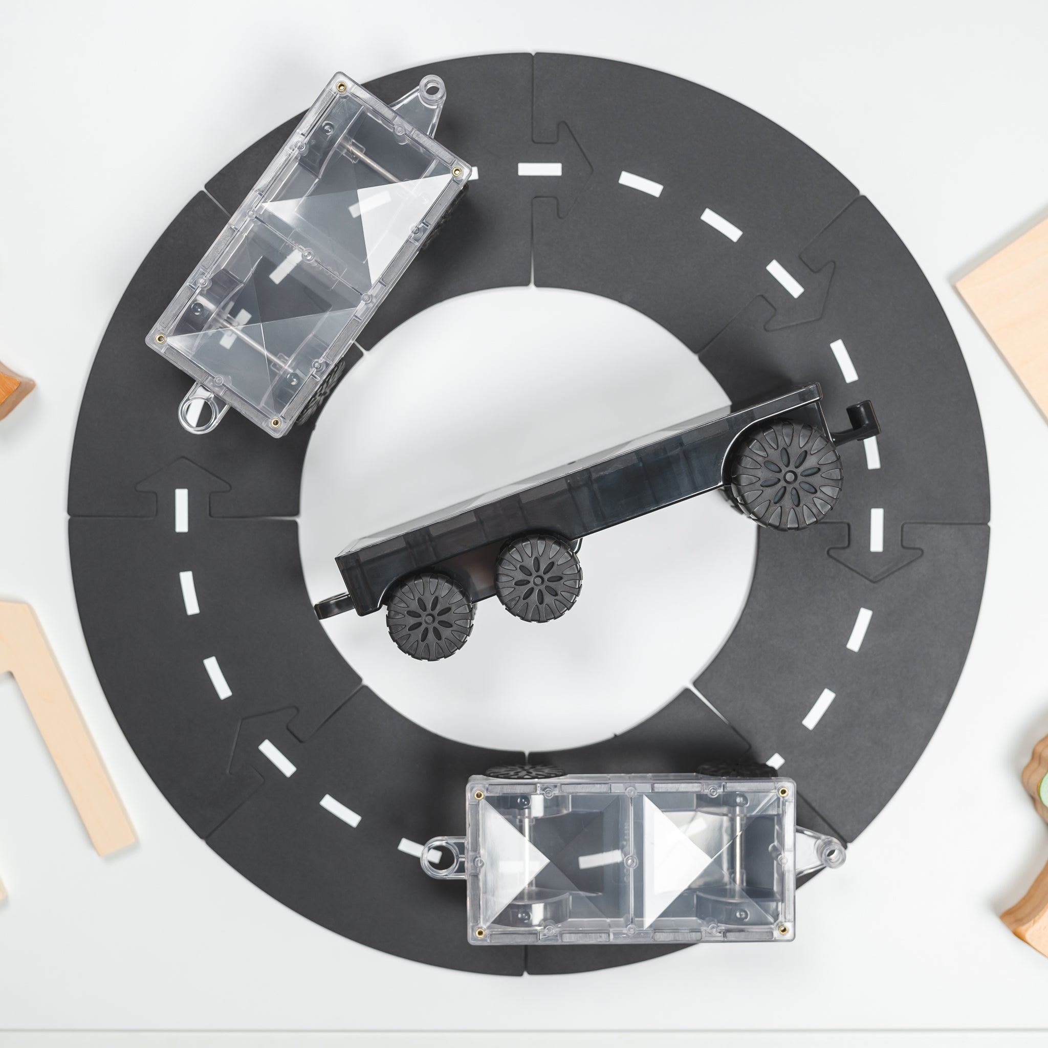 Designed with vehicle enthusiasts in mind, this pack takes magnetic tile play up a gear! Featuring our iconic REVERSIBLE transport base, two clear motion bases with REAL rubber wheels, plus a range of magnetic tile shapes, the CONNETIX 50 Piece Rainbow Transport Pack allows you to imagine and create endless vehicle designs.