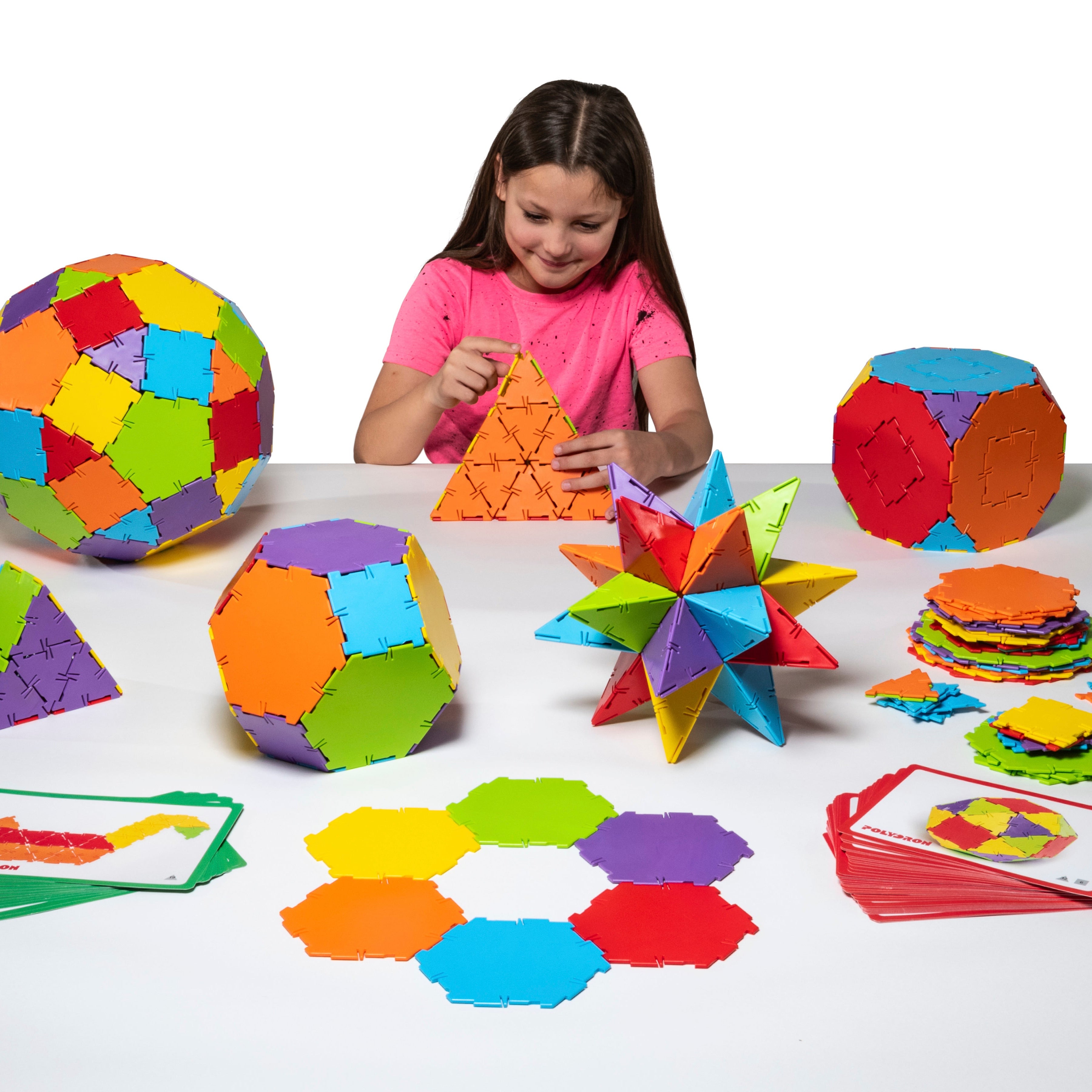 Set includes: 60 squares, 90 equilateral triangles, 24 pentagons, 30 hexagons, 12 octagons, 60 isosceles triangles and 24 workcards.
