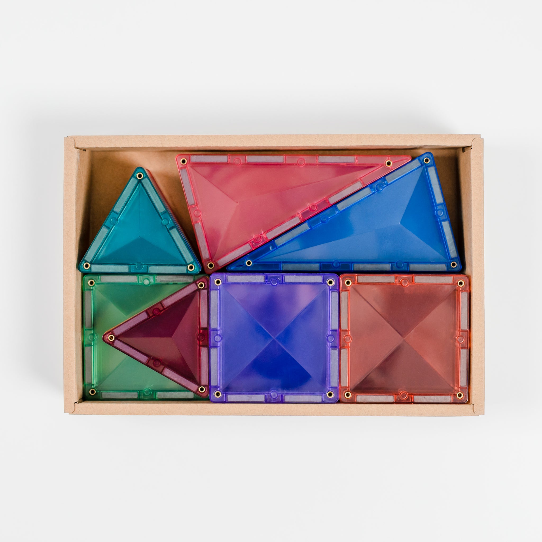 Set includes: 32 Magnetic tiles in assorted shapes and colours