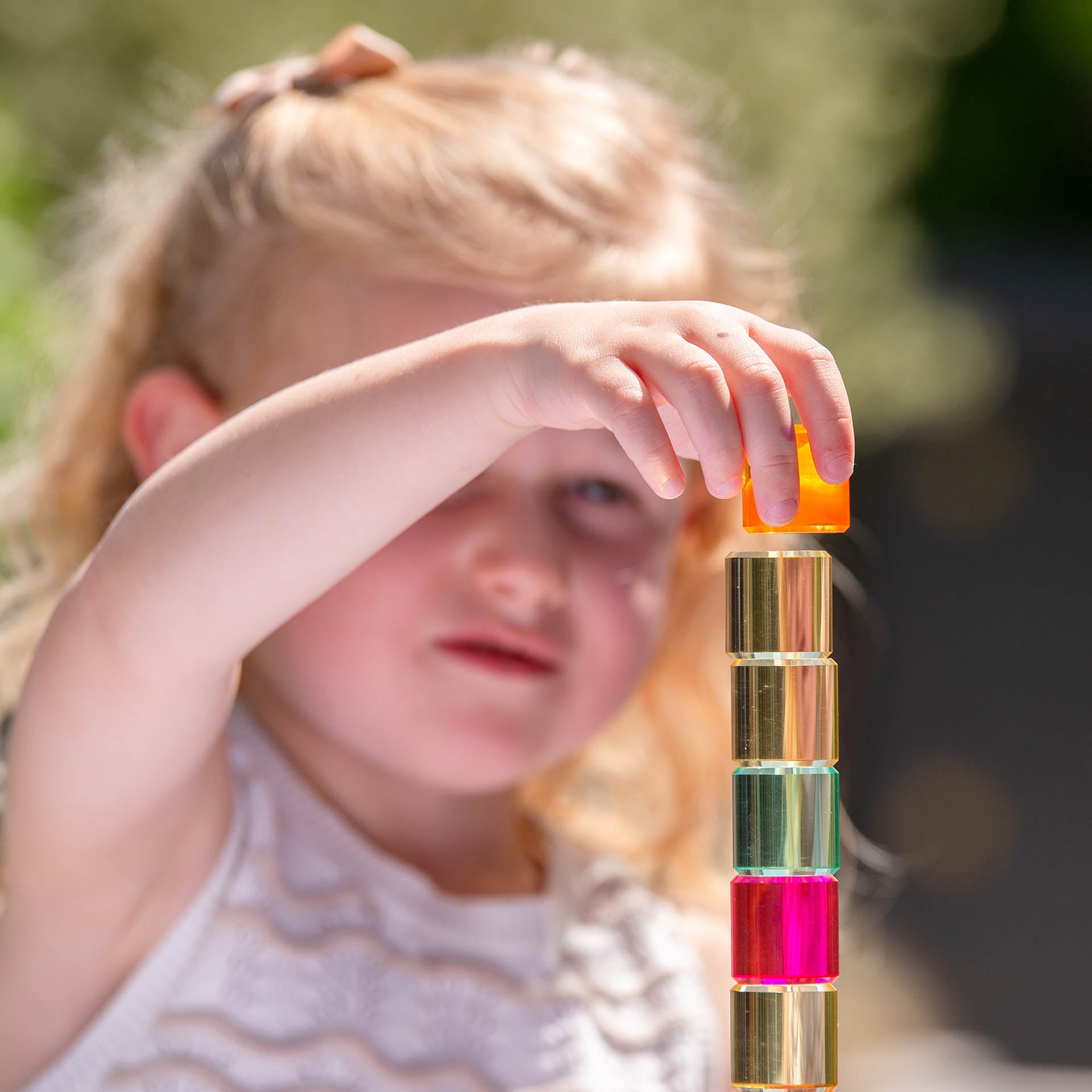 Unlock endless possibilities with this captivating gem circle collection. Fifty translucent acrylic cylinders in five radiant colours rest within an FSC-certified beechwood tray boasting a mirrored acrylic base that amplifies light into a spectacular rainbow display. Each gem features perfectly smooth edges and a satisfying tactile quality, creating delightful musical tones when rolled and shuffled together. As light passes through the gems and bounces off the mirrored foundation, children witness mesmerising internal reflections and prismatic effects that spark wonder and curiosity.