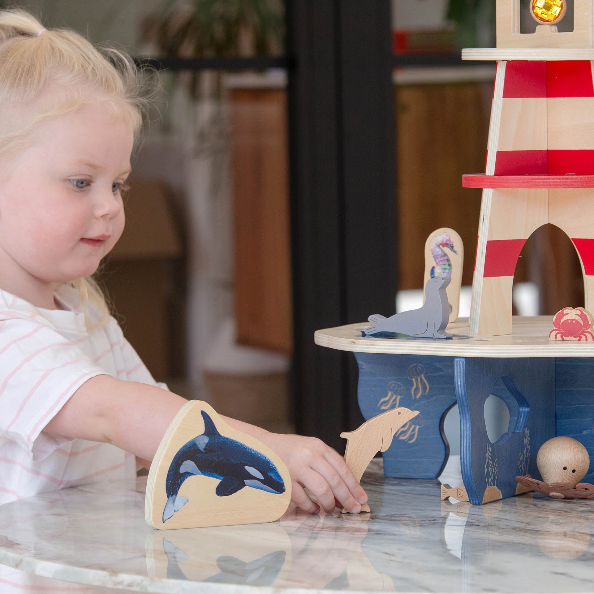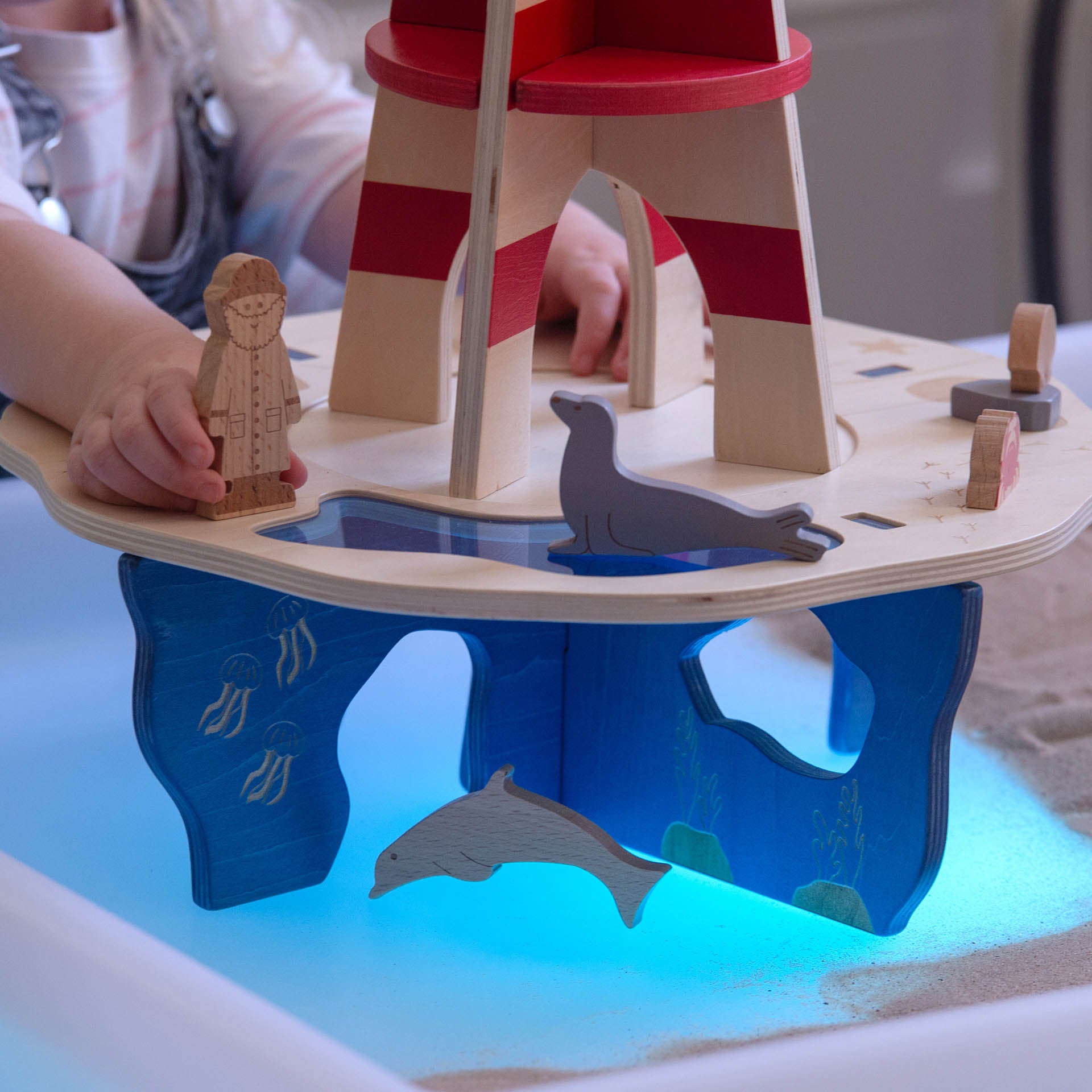 Deeply lasered tactile features invite sensory discovery, whilst the rotating wooden gem crowning the lighthouse adds interactive magic and visual delight. A removable clear acrylic rock pool nestles at the base, perfect for exploring tide pool creatures and coastal ecosystems.
