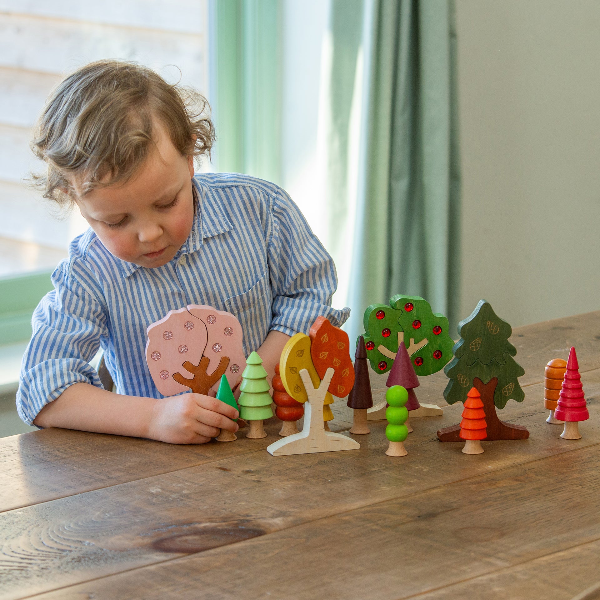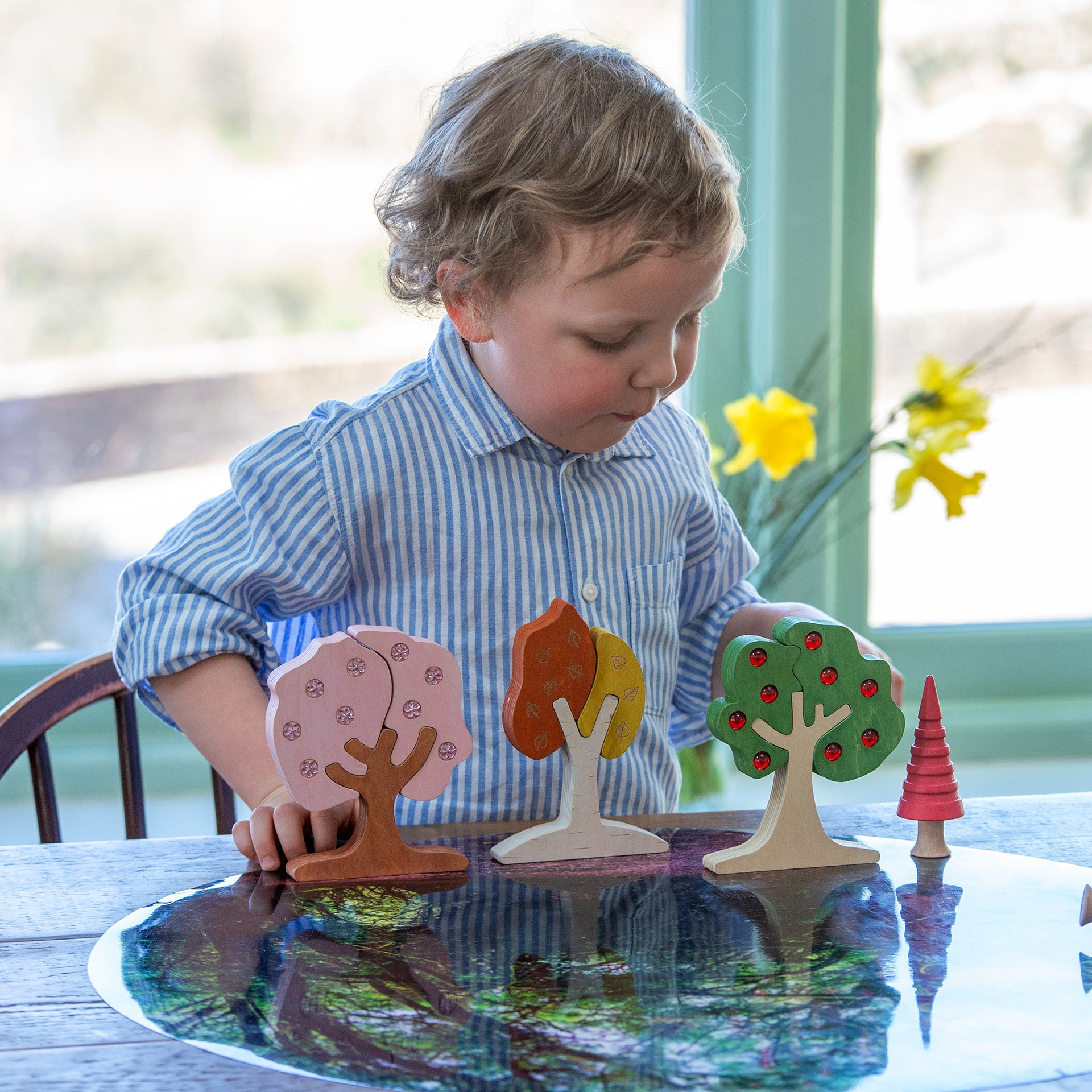 Explore the changing seasons with this beautiful set of chunky wooden trees, each representing a different time of year—evergreen for winter, cherry blossom for spring, apple for summer, and silver birch for autumn.