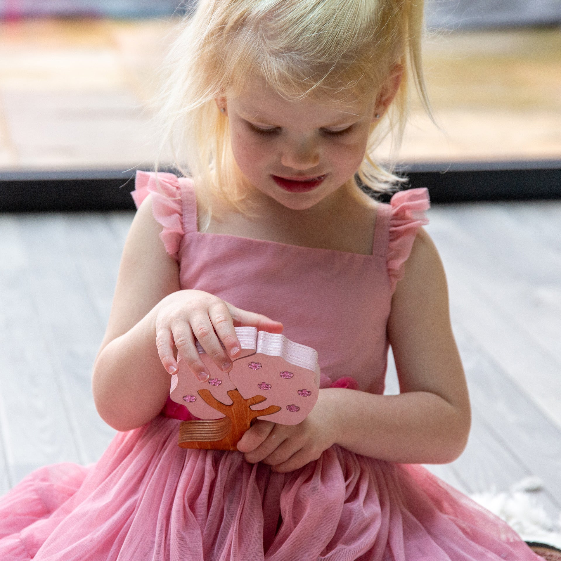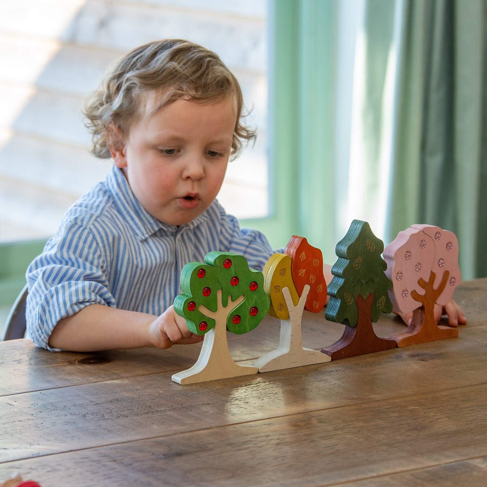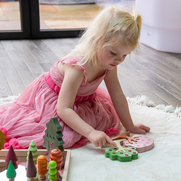 Crafted from sustainable FSC-certified birch plywood, each tree features laser-etched details that offer a rich sensory experience. The apple and cherry blossom trees are extra special, with smooth, shiny inset gems that mimic fruit and flowers—perfect for curious little hands to discover.